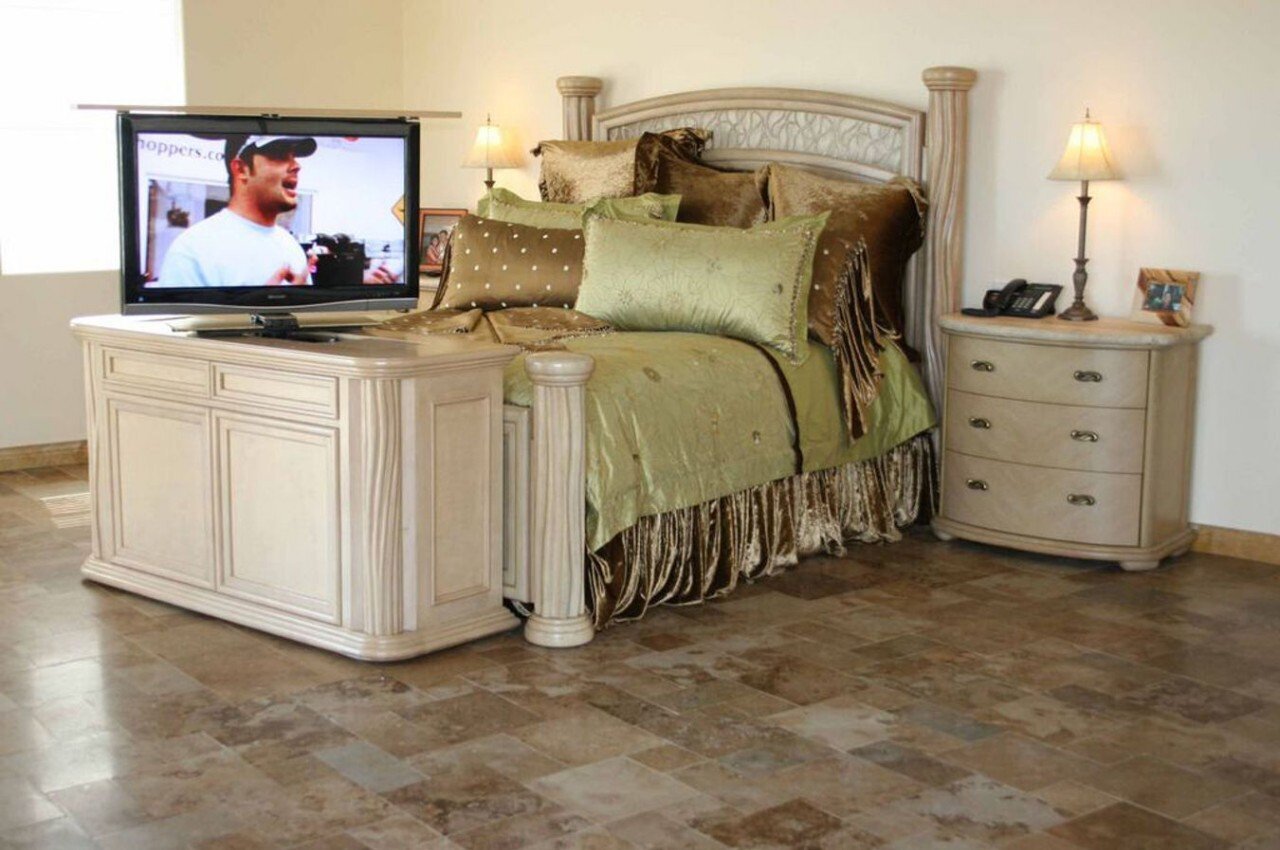 사용 가능한 다양한 침대 디자인 중 일부는 발판에 TV를 통합하여 볼 수 있도록 들어 올리고 전기 모터를 사용하여 아래로 밀어 숨길 수 있습니다. 이 옵션은 일단 침대에 통합되면 매끄럽고 편리한 TV 시청 경험을 제공하기 때문에 우리가 가장 좋아하는 옵션 중 하나입니다.