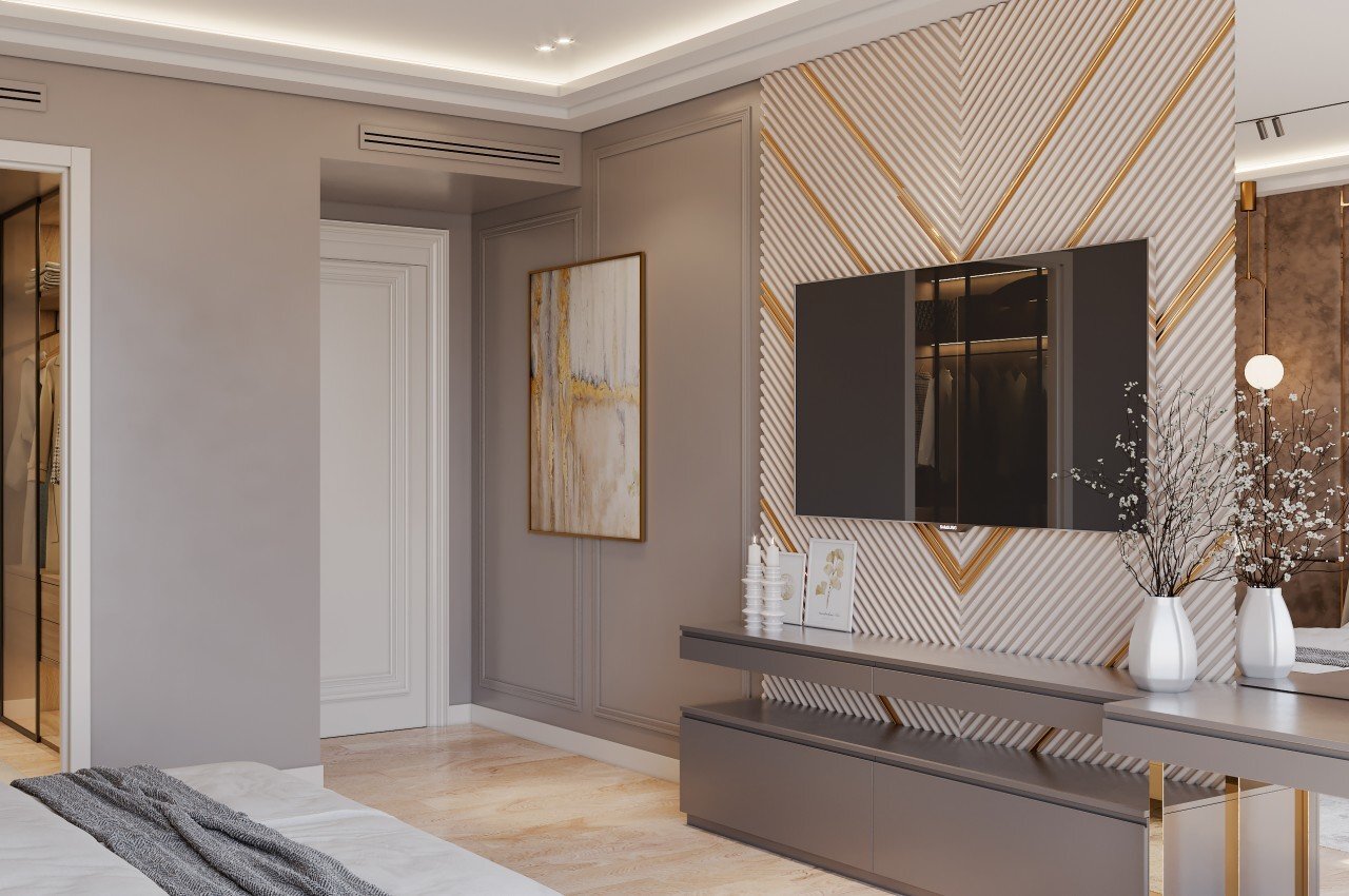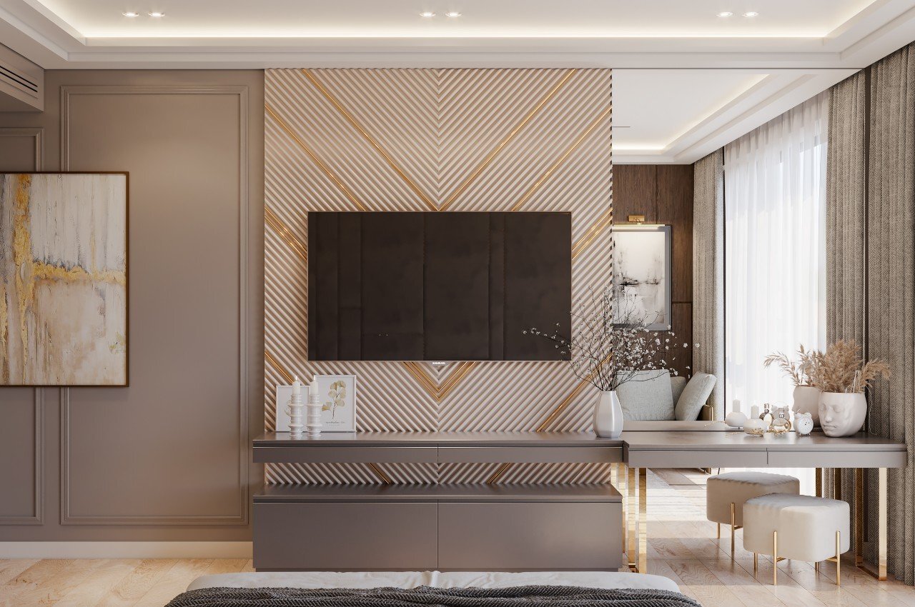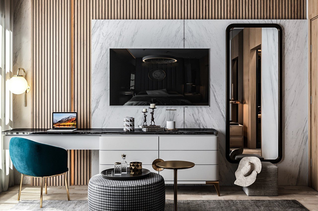 이 침실의 TV는 대리석 벽 패널에 장착되어 있습니다. 벽은 또한 TV, 책상, 높은 벽 거울을 통합하여 여러 기능을 수행하여 방의 분위기를 밝고 미묘하게 유지합니다.
