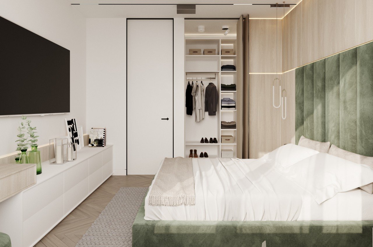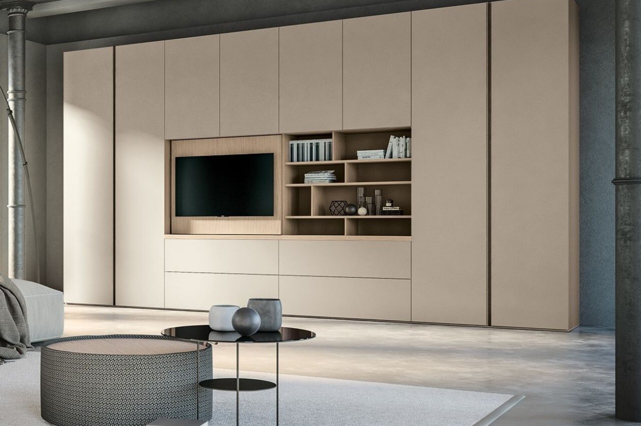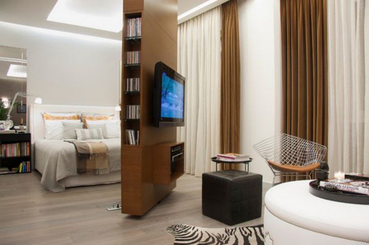 이 배치는 방에 있는 기기를 좋아하지 않는 사람들에게 적극 권장되며 이 배치의 가장 좋은 점은 공간을 최대화할 뿐만 아니라 매끄럽고 정리된 침실을 만든다는 것입니다. 그러나 선택하는 문 유형에 주의를 기울여야 합니다. 기존의 여닫이 문을 선택하려면 화면을 보면서 문을 열어 두어야 하므로 편리하지 않을 수 있습니다. 대신 더 실용적인 대안을 고려하십시오. 슬라이딩 도어 시스템은 침실이나 가정의 다른 방에서 기술을 숨기기 위한 탁월한 솔루션을 제공합니다.