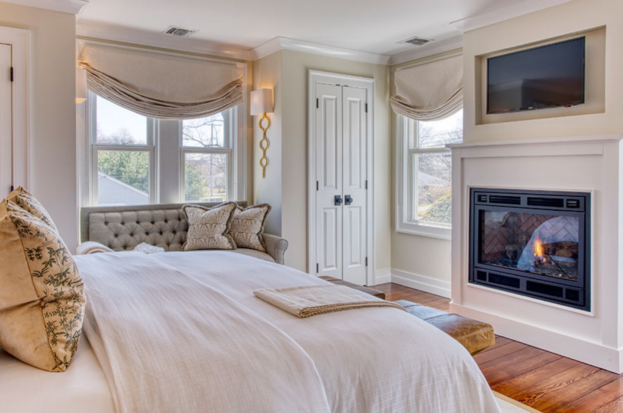 침실에 벽난로가 있는 경우 벽난로 선반 위에 TV를 설치하는 것이 시각적 영향을 줄이는 훌륭한 방법이므로 권장됩니다. TV 장치는 침실 장식과 조화를 이루고 시각적 영향을 줄입니다.