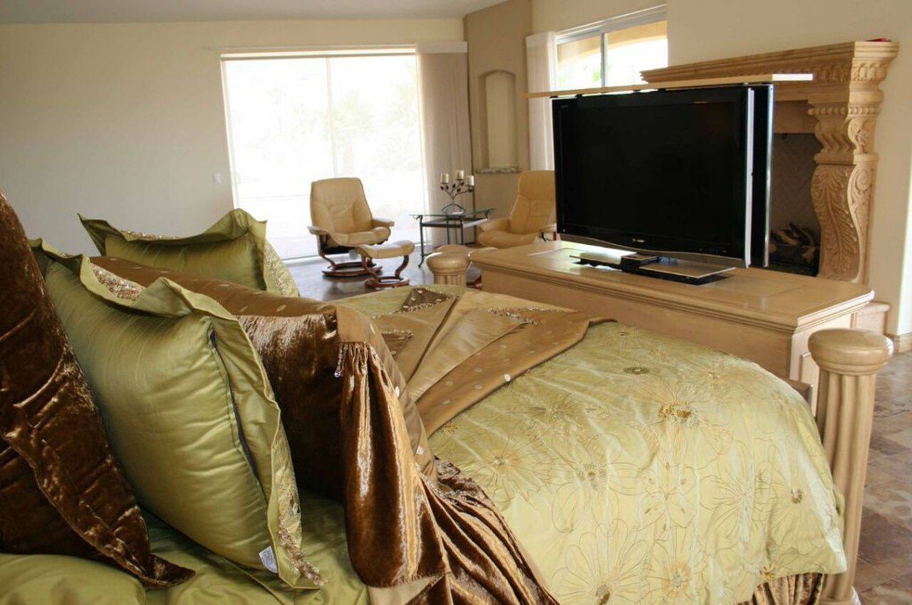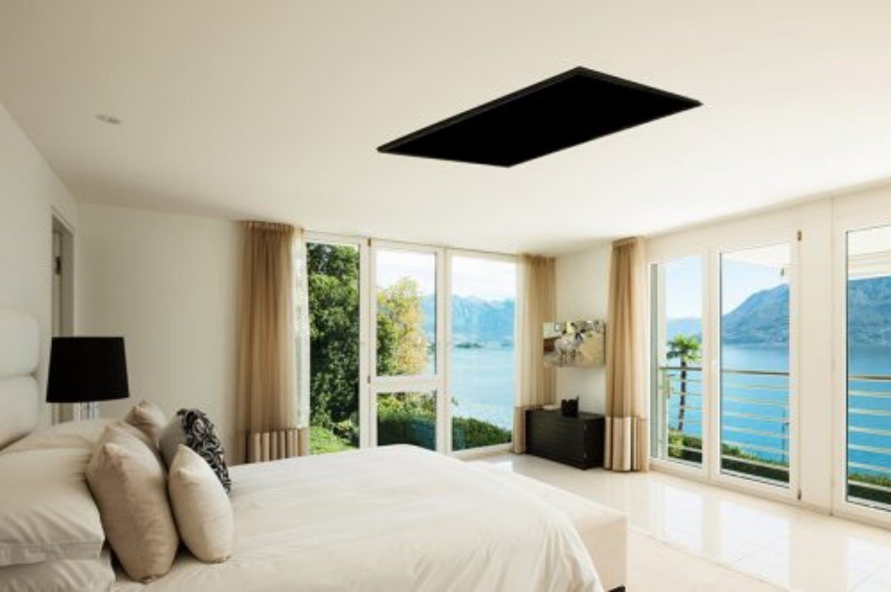이 침실은 멋진 야외 전망을 제공하므로 이 드롭다운 TV는 사용 중일 때 끌어내릴 수 있고 전원을 끌 때 천장 내부에 숨길 수 있습니다. 햇빛을 차단하고 TV 화면의 눈부심을 방지할 수 있도록 불투명 커튼, 블라인드, 투명 커튼과 같은 윈도우 트리트먼트를 사용하세요. 이것은 귀중한 벽 공간을 희생하지 않고 TV를 눈에 띄지 않게 숨길 수 있는 좋은 방법입니다.