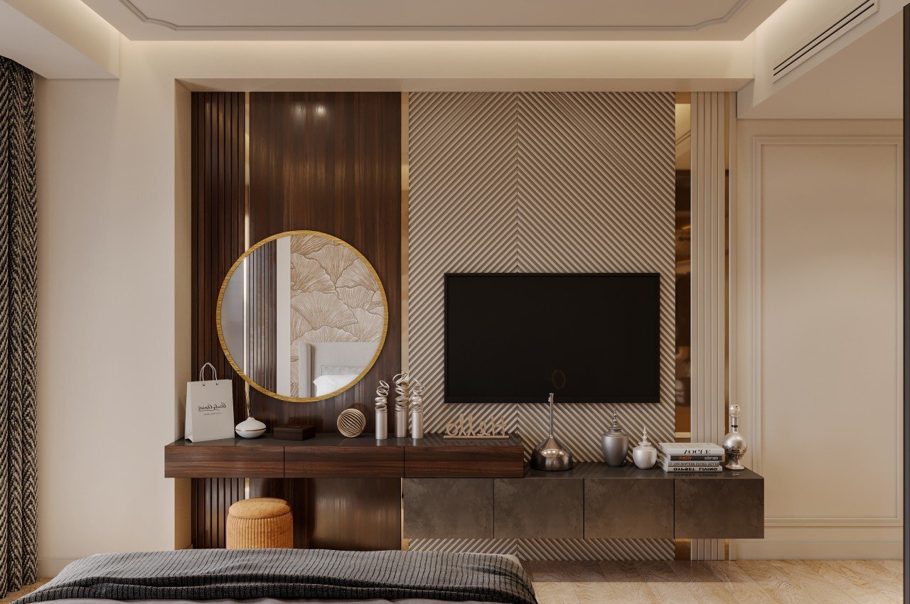 이 예에서 서랍장과 TV는 갈색, 금색 및 황백색의 색조로 침실 전체 장식과 조화롭게 조화를 이루는 다기능적이고 미학적으로 만족스러운 디자인으로 설계되었습니다. TV 후면의 패턴 표면은 원형 거울과 일직선을 이루며 TV의 외관을 더욱 돋보이게 합니다.